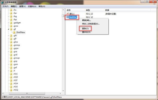 HKEY_CLASSES_ROOT\.gf\ShellNew】,右键单击【NullFile】,左键单击【删除(D)】。