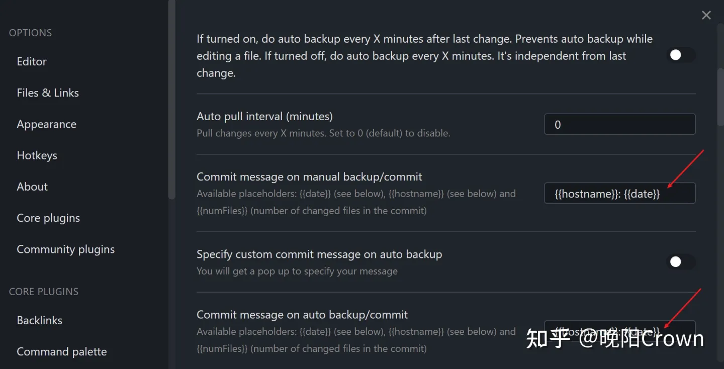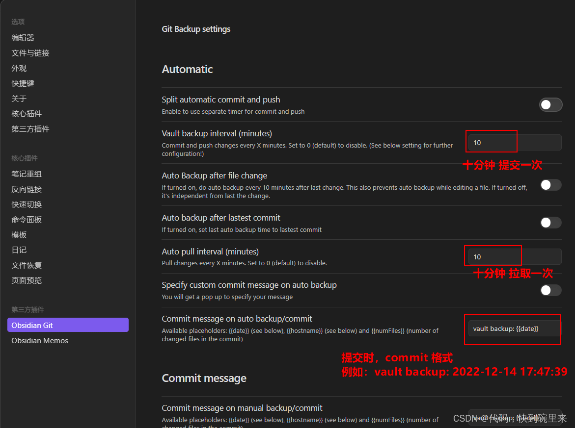 打开插件设置界面,可以修改一下自动提交和手动提交的日志,我设置的是主机名 + 日期: