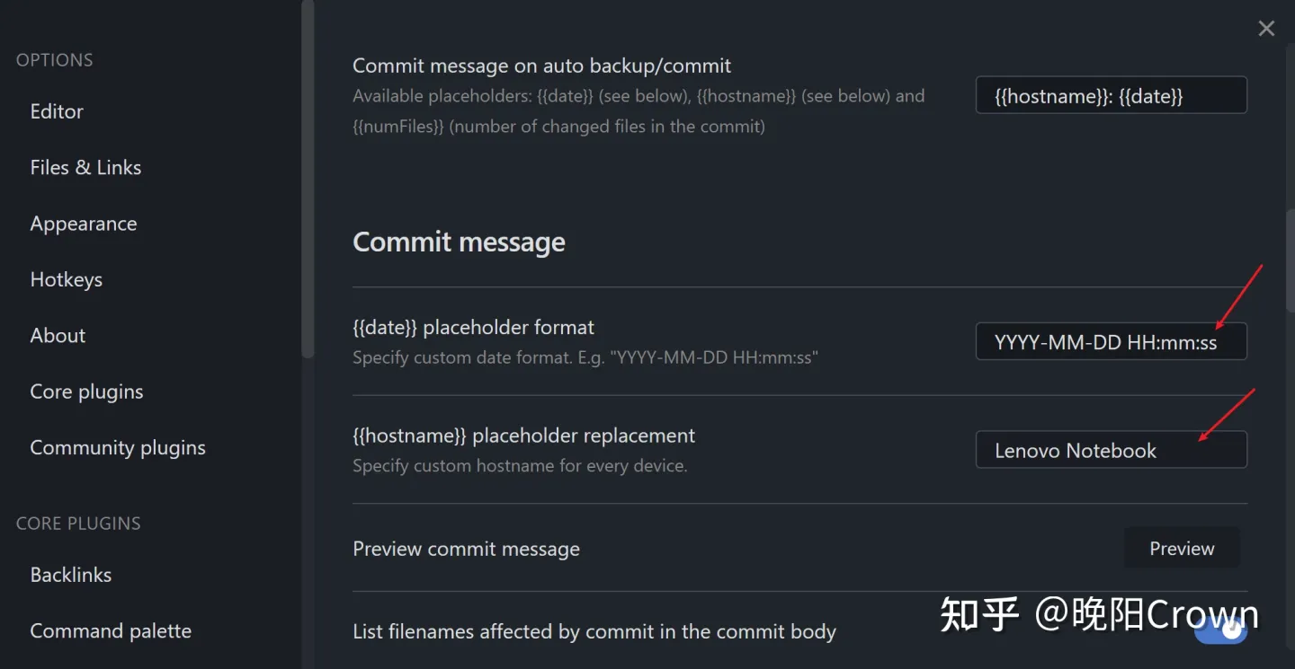 在提交信息设置里,可以修改主机名和日期格式,修改完成后点 Preview 可以预览提交信息: